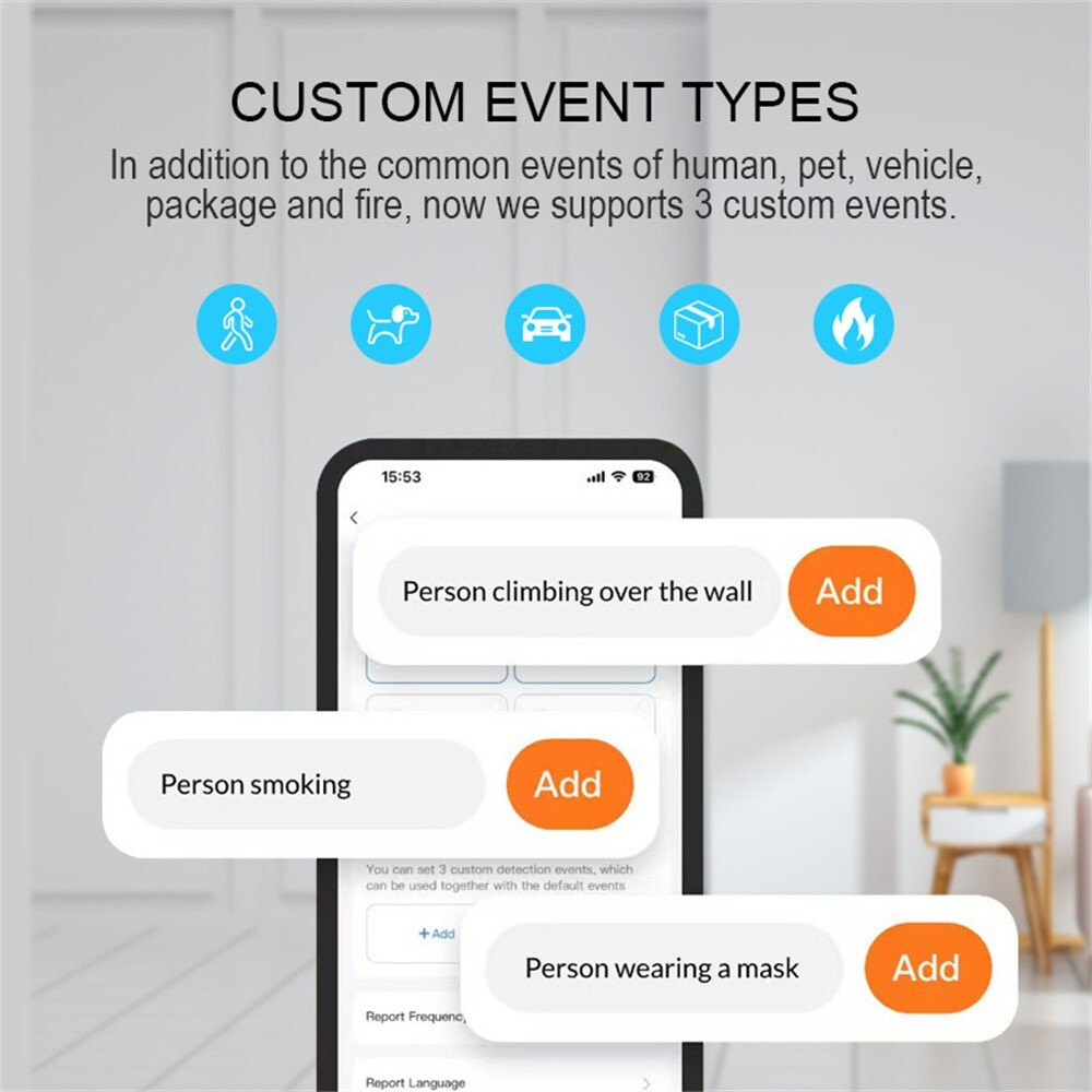 Built-in PIR motion sensor with intelligent AI detection supports up to 8 event types including human, pet, vehicle, package, fire detection plus 3 customizable events, automatically triggering notifications to your smartphone.